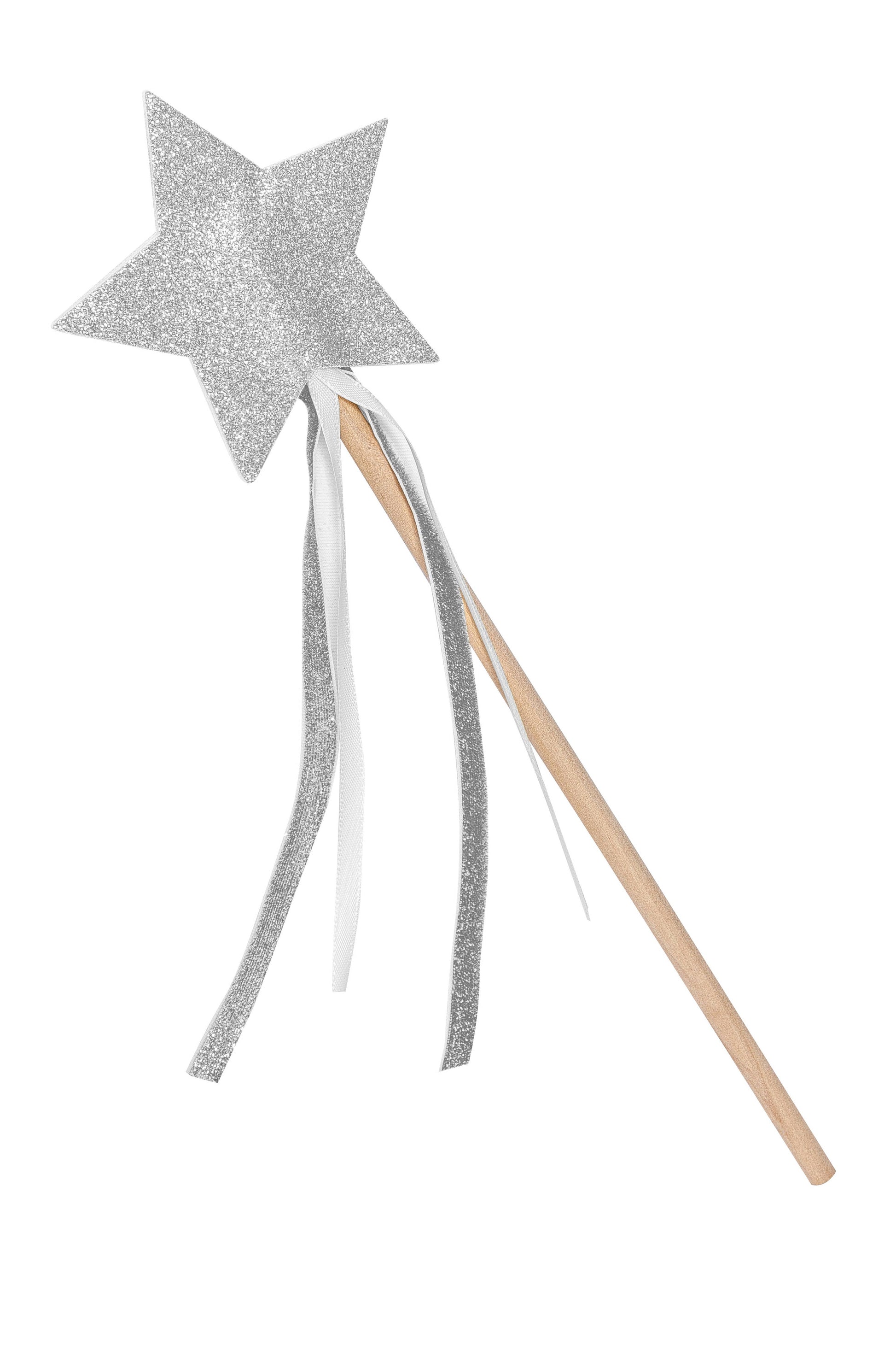 La baguette magique en bois, faite de feutrine et d’un tissu pailleté, elle est dotée de deux rubans pailletés et deux rubans satin.