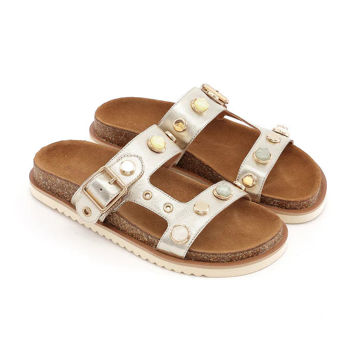 Sandales de la marque Emily Karston Modèle Calliope Couleur Platine La collection Emily Karston allie élégance moderne et confort du quotidien, avec des chaussures au design féminin, faciles à porter et pensées pour accompagner chaque moment de la journée.